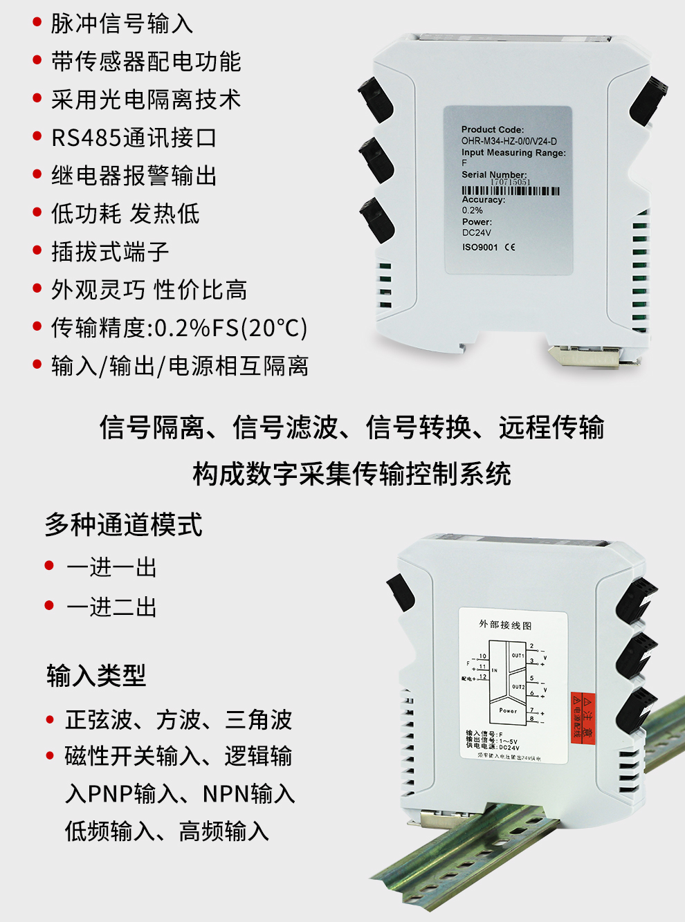 OHR-M34系列智能頻率轉換器將頻率信號經隔離整形放大后,變送隔離輸出所需的信號,也可向現場的一次儀表提供電源回路。