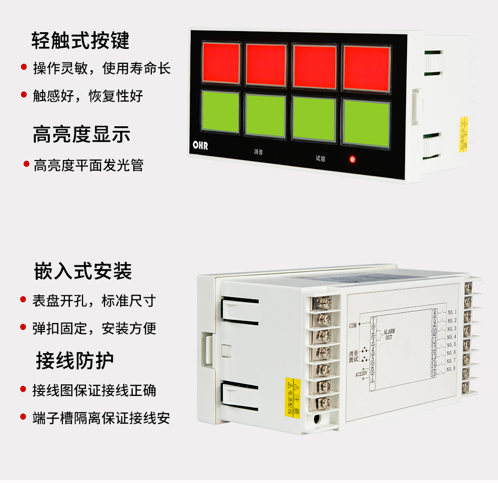 八路閃光報警器是一種接點式聲光報警顯示儀表,具有電路簡單、元件少、可靠性高、抗干擾能力強、低功耗、低噪聲、EMC電磁兼容等特點,廣泛運用于電力、石化、冶金、輕工、制藥、航空等諸多領域。
