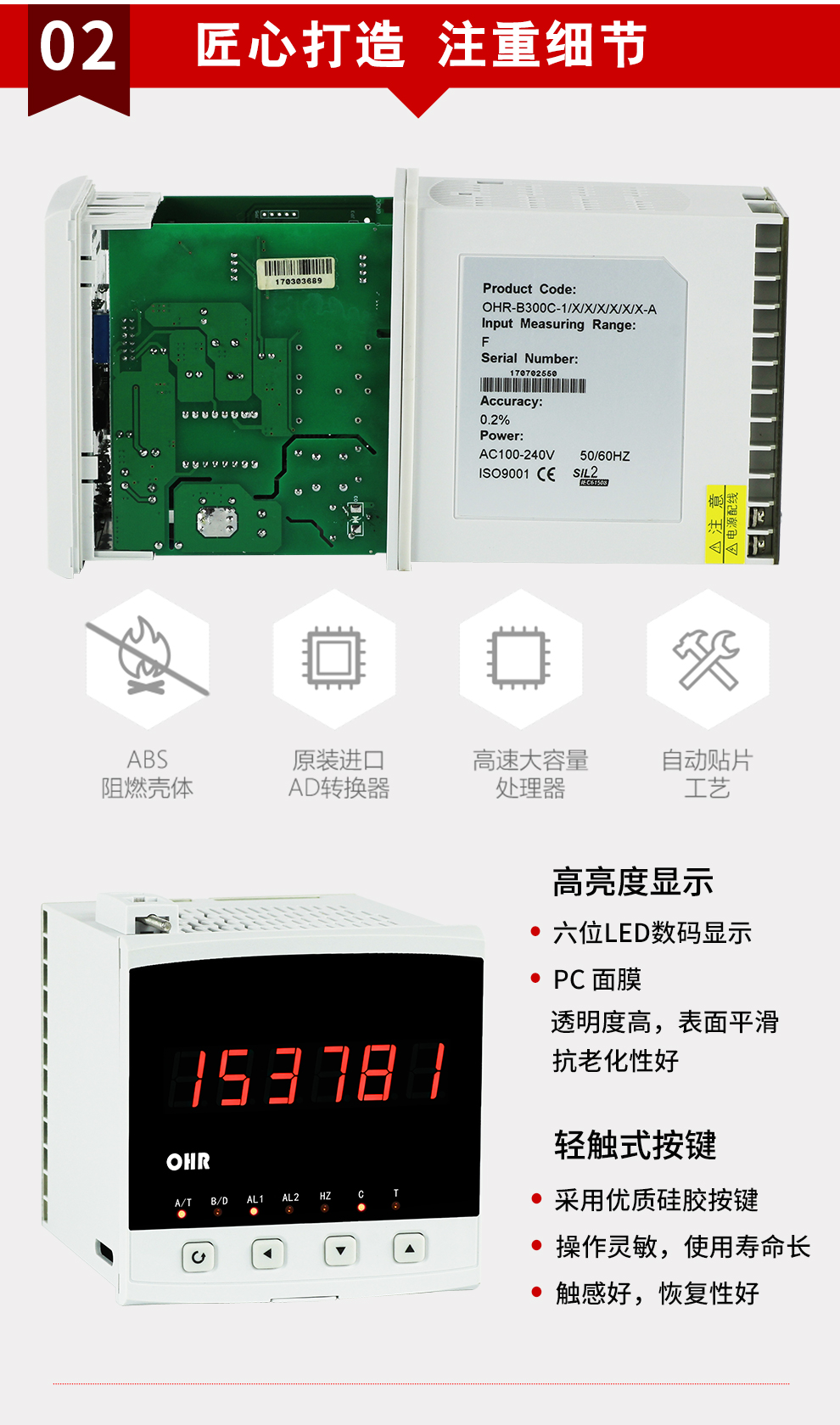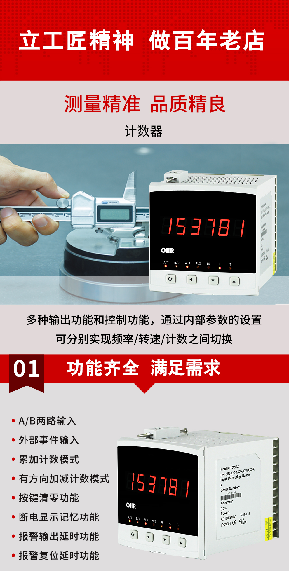OHR-B300系列計數(shù)器采用全自動貼片封裝工藝,具有很強的抗干擾能力,并具有多種輸出功能和控制功能,多種計數(shù)模式,廣泛運用于電力、石化、冶金、輕工、制藥、航空等諸多領(lǐng)域。