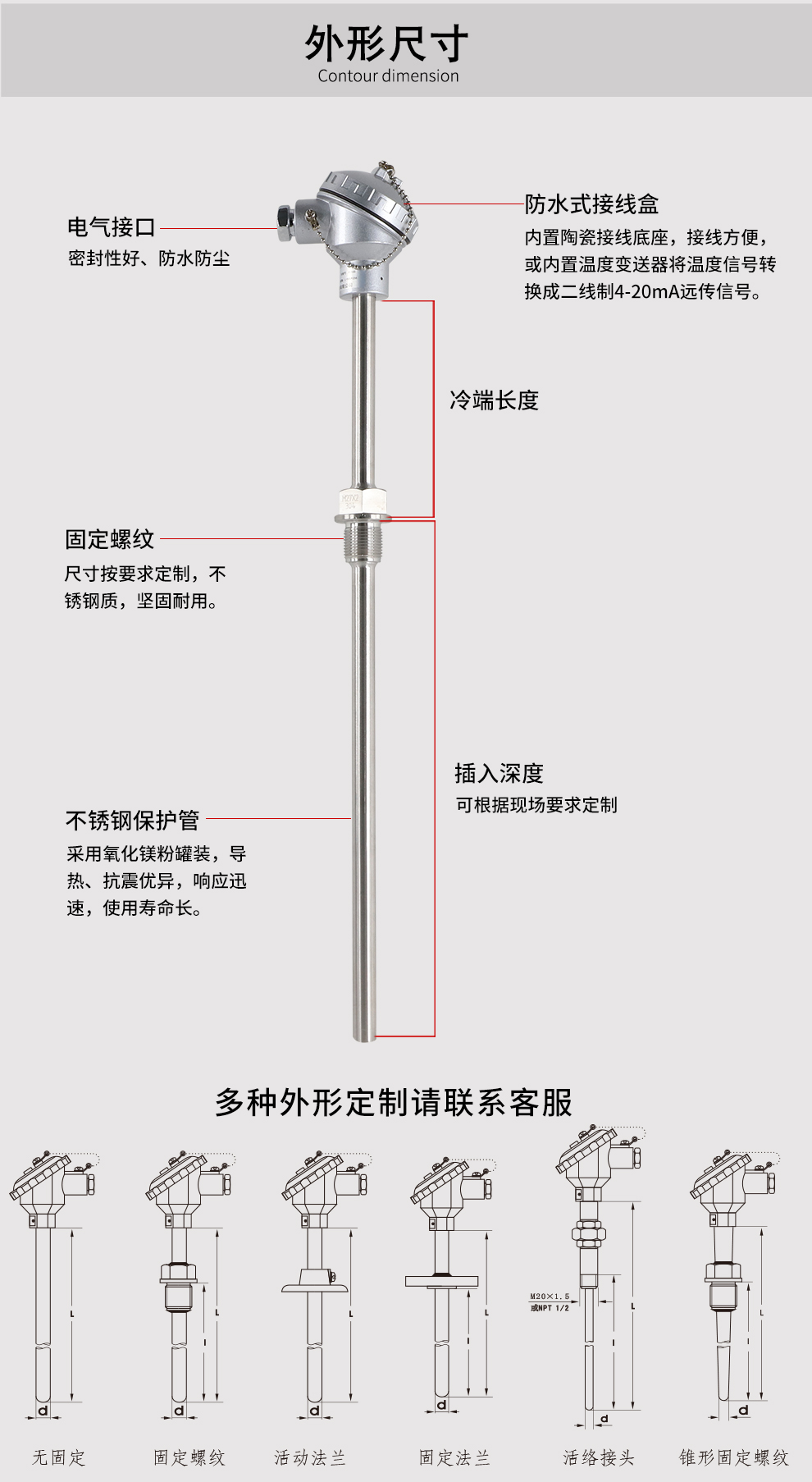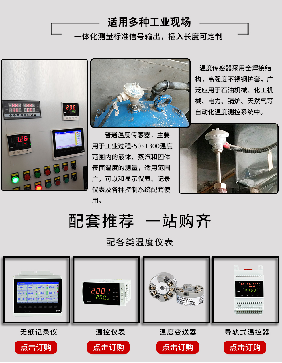 裝配式熱電阻熱電偶作為溫度測量傳感器,通常與溫度變送器、調節(jié)器及顯示儀表等配套使用,組成過程控制系統(tǒng),用以直接測量或控制各種生產過程中流體、蒸汽和氣體介質以及固體表面等溫度。